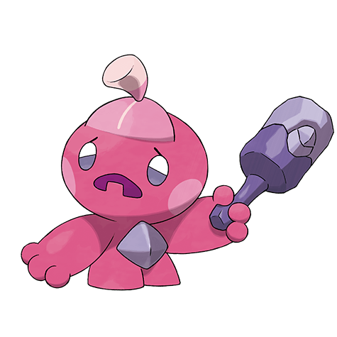 It swings its handmade hammer around to protect itself, but the hammer is often stolen by Pokémon that eat metal.